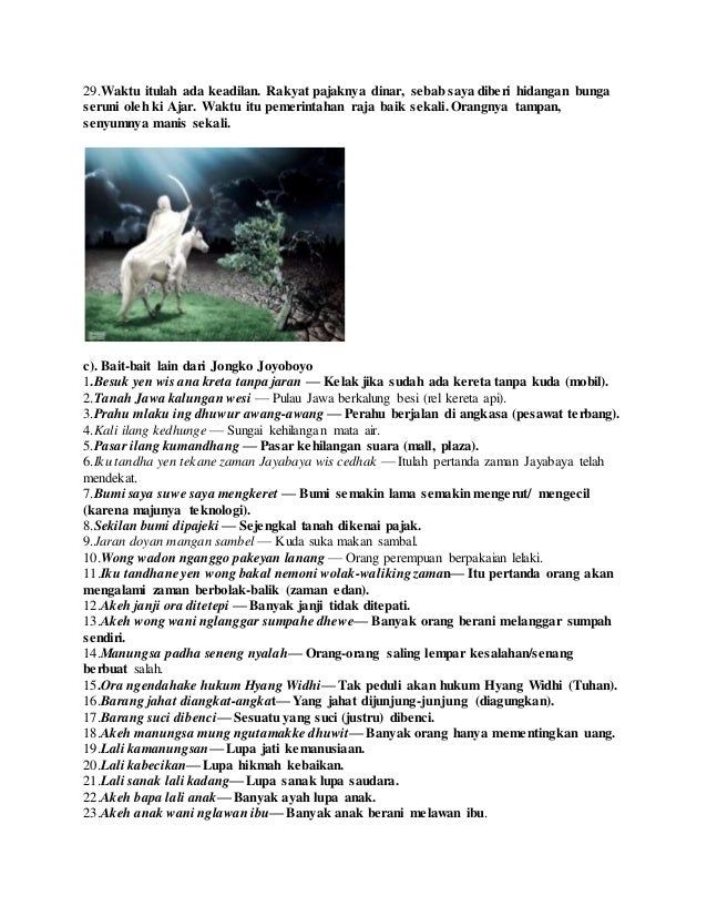0:00. Sonora.ID - Prabu Sri Aji Jayabaya merupakan raja yang paling diingat masyarakat karena berbagai ramalannya. Menurut catatan sejarah, sejak tahun 1135 hingga 1159, Jayabaya memerintah Kerajaan Kediri mencapai masa kejayaannya di masa pemerintahan Raja Sri Jayabaya. Peran Tokoh Agama di Balik Ramalan Raja Jayabaya. Avirista Midaada, Okezone · Selasa 26 Juli 2022 05:33 WIB. Prabu Jayabaya (Foto : Istimewa) A A A. PRABU Jayabaya, penguasa Kerajaan Kediri ini dikenal dengan ramalannya. Beberapa ramalan Jayabaya mengenai kondisi Pulau Jawa disebut akurat dan konon terbukti hingga saat ini. Ada beberapa serat.